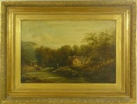 22 - H.A. PERRY 19th C OIL PAINTING ON CANVAS OF CABIN H.A. Perry oil painting on canvas depicting settlers fly fishing and moving livestock on a settlement by the river. Signed and dated 1872 lower left. Measures 20" (51cm) width by 14" (36cm) height plus 5" (13cm) frame.