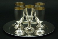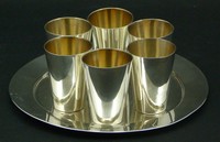 23 - 6PC STERLING SILVER KIDDISH CUPS ON TRAY 6 pieces sterling silver kiddish cups with tray. Measures 6" (15m) diameter & 3" (8cm) height, total weight 6 ozt.