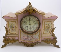 24 - FRENCH HAND PAINTED PORCELAIN MANTEL CLOCK Antique French sevres style hand painted & ormolu porcelian mantel clock. Measures 11" (28cm) height by 15" (38cm) width by 5" (13cm) depth.