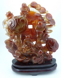 25 - CHINESE CARNELIAN CARVING OF CHILDREN w COINS Chinese carnelian agate sculpture depicting children with coins. Measures 10 1/2" (26.5cm) + 2" (5cm) wooden base.