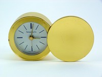 31 - TIFFANY & CO SWISS MADE BRASS DESK CLOCK Tiffany & Co swiss made brass desk clock. Measures 2 1/2" (6cm) diameter, total weight 389g.