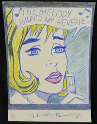 34 - MANNER OF LICHTENSTEIN MIXED MEDIA STUDY ON PAPER Mixed media (Pencil and crayon) sketch study of "The Melody Haunts My Reverie" on paper in the manner of Roy Lichtenstein's famous works. Colored with blue, yellow & red. Measures 8 1/2" (21cm) height by 6" (15cm) width.