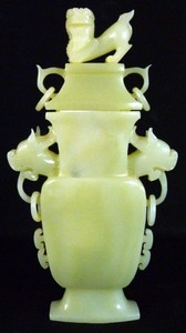 35 - CHINESE CARVED JADE FOO DOG URN Chinese carved jade lidded vase with foo dog handles and finial. Measures 11" (28cm) height.