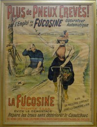 37 - LA FUCOSINE FRENCH ADVERTISMENT POSTER BY BAER G La Fucosine vers 1900 BAER G. Plus de pneux crevés! Par l'emploi de la Fucosine, obturateur automatique. Champenois Paris Aff. N.E. B.E. B + Traces de plis, déchirures dans les marges..Imp. F. Champenois - Paris. Advertisment poster; Measures 63" (160cm) height by 45" (114cm) width.