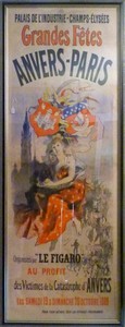38 - VINTAGE FRENCH PARISIAN FAIR POSTER Vintage poster for a Parisian fair organized by Le Figaro to benefit the victims of "The Antwerp Catastrophe": On September 6th of that year, an explosion ripped through a dynamite factory, killing 300 people. The two cities, with their crests shown, are symbolized by two women, with Paris, in a starry robe, comforting a grieving Antwerp. "Palais De L'industrie-Champs-Elysees, Grandes Fetes,Anvers-Paris" poster by artist Jules Cheres. Measures 99" (251cm) height by 39" (99cm) width.