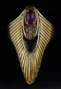 44 - 14K GOLD "ERTE" LIMITED ART DECO RING 14k yellow gold signed "Erte" and numbered 206/250 art deco ring with diamonds and rubies. Size 5, total weight 6g (4 dwt).