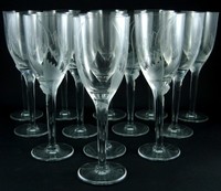 11 - 13pc LALIQUE FRANCE "ANGE" CRYSTAL WINE GLASSES 13 pieces Lalique France crystal wine glasses titled "Ange". Each glass depicts an angel at the stem with its wings expanding onto the cup of the glass. This is a very rare pattern that was originally designed in 1948. Each glass measures approx 8" (20cm) height, total lot weight is approx 2718g.