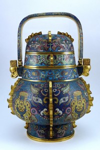 14 - CHINESE QIANLONG BRONZE CLOISONNE ZHI VESSEL Chinese taotie bronze cloisonne "zhi" multi tier covered vessel with handle. Gold gilt enamel outlines the vessel. Holds the four character Qianlong reign mark to bottom. Measures 13" (33cm) height by 8" (20cm) width, total weight 3741g.