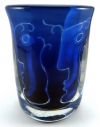 15 - INGEBORG LUNDIN GLASS ARIEL VASE FOR ORREFORS An Ingeborg Lundin glass Ariel vase for Orrefors Glassworks, circa 1960. Blue in color with outlines of abstract faces. Signed to bottom and numbered 348-e7. Measures 7" (18cm) height, total weight 4197g.