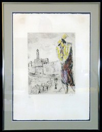 16 - MARC CHAGALL KING DAVID HAND COLORED ETCHING King David hand-colored etching by Marc Chagall from the biblical series. Numbered 56/100 lower left and signed "M.Ch." lower right in pencil. Measures 21" (53cm) height by 15" (38cm) width plus 2" (5cm) frame and matting.