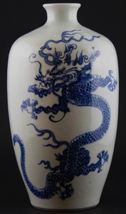 18 - CHINESE KANGXI BLUE & WHITE DRAGON LIUYEPING VASE Chinese hand painted porcelain Kangxi blue and white dragon liuyeping "willow leaf" shaped vase. Holds Kangxi calligraphy mark to bottom. Measures 11 1/2" (29cm) height, total weight 1979g.