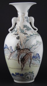 22 - CHINESE PORCELAIN LOBED DEER VASE Chinese porcelain lobed vase with hand painted deer in landscape and gilt elephant form handles. Calligraphy poem to verso. Measures 14" (36cm) height, total weight 1759g.