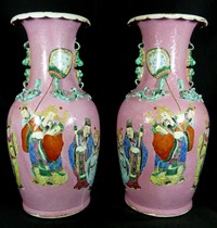 24 - PAIR CHINESE PORCELAIN FAMILLE ROSE TEMPLE VASES Pair of Chinese hand painted porcelain famille rose temple vases depicting multiple paintings of scholars over a pink ground with applied porcelain foo lion handles and dragon decorations. Each measures 18" (46cm) height by approx 9" (23cm) width.