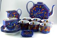 25 - 16pcs HERMES "MARQUETERIE" PORCELAIN TEA SET Hermes Paris "Marqueterie" De Pierres D'Orient Et D"Occident porcelain tea set. Including coffee or teapot -10 1/2" (26cm) height by 8" (20cm) width- creamer -5 3/4' (14cm) width by 5" (13cm) height- sugar bowl -4" (10cm) width by 3 1/2" (9cm) height- 6 tea cups -2 1/4" (6cm) height by 3 1/4" (8cm) diameter-6 saucers -5 1/2" (13cm) diameter- small dish - 3 1/4" (8cm) height and width. Total 16 pieces.
