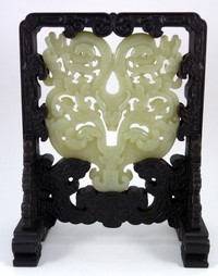 26 - LARGE CHINESE CARVED CELADON JADE ENCASED PLAQUE Large Chinese celadon jade plaque depicting various carvings of beasts. The plaque is encased by a beautiful hand carved Zitan wood frame with ornate decorations. Jade plaque measures 6 1/2" (16cm) height by 5 1/2" (14cm) width, frame measures 9 1/2" (23cm) height by 7 1/2" (19cm) width. Total lot weight 1034g.