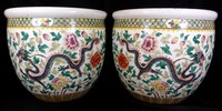 29 - PAIR CHINESE PORCELAIN FAMILLE VERTE PLANTERS Pair of Chinese hand painted porcelain famille rose planters depicting dragons within a floral scene. Each measures 12 1/2" (32cm) height by 14" (36cm) width