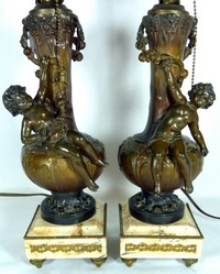 32 - PAIR AUGUSTE MOREAU BRONZE PUTTI FIGURAL LAMPS Bronze putti lamps on marble bases with decorative ormolu beads after Auguste Moreau. Each lamp is signed. Each measures 26" (66cm) height, total lot weight 17.55lb.