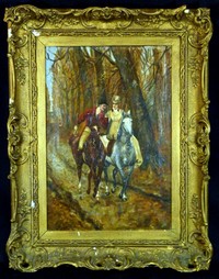 33 - HEYWOOD HARDY OIL PAINTING ON CANVAS Oil painting on canvas depicting a man and a women on horseback riding through the woods attributed to Heywood Hardy (British 1842-1933). Measures 19" (48cm) height by 13" (3cm) width plus 4" (10cm) frame.