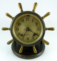 36 - CHELSEA BRONZE ENCASED SHIPS BELL CLOCK Chelsea bronze encased ship's bell clock in the form of a ship's wheel. Includes key. Measures 7" (18cm) height and width, total weight 2917g.
