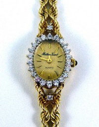 37 - MATHEY TISSOT 14K GOLD WOMANS WATCH w DIAMONDS Mathey Tissot 14k gold woman's wrist watch and rope chain band. Diamond bezel with gold face. Marked on watch and clasp. Measures 7" (18cm) length, total weight 16g (10.6dwt).