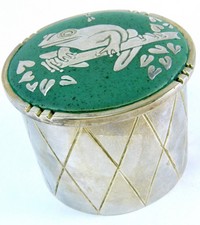 38 - EMILIA CASTILLO SILVER PLATED LIDDED BOX Emilia Castillo Mexican silverplate lidded box with a decorative frog on lid. Measures 2 1/4" (6cm) height, total weight 253g (8.1ozt).