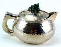 39 - EMILIA CASTILLO SILVER PLATED MALACHITE TEAPOT Emilia Castillo Mexican silverplate teapot with a decorative malachite frog finial. Measures approx 3" (8cm) height, total weight 219g (7ozt).