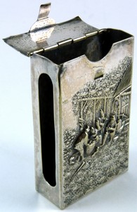 42 - LARGE DANISH ANTIQUE SILVER REPOUSSE MATCH CASE Large Danish antique silver repousse matchbox holder depicting a village scene in high relief. Measures 3 1/2" (9cm) height by 2 1/4" (5cm) width, total weight 72g (2.3ozt).