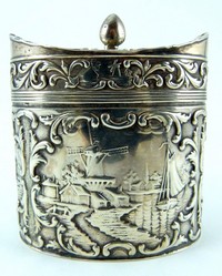 43 - H. HOOIJKASS DUTCH ANTIQUE SILVER REPOUSSE BOX H. Hooijkaas Antique Dutch silver repousse snuff box depicting a windmill in the distance of a Dutch landscape scene in high relief. Measures 3" (8cm) height by 2 3/4" (6cm) width, total weight 87g (2.7ozt).