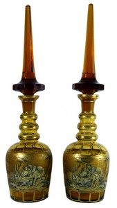 49 - PAIR PALATIAL BOHEMIAN GILT GLASS DECANTERS Pair of large Bohemian glass decanters with a gold wash. Heavily decorated with gilt bands and designs. Each decanter depicts a scene of two lovers, black paint over a gilt background. Large pointed stoppers top off each piece. Each measures 26" (66cm) height by 7" (18cm) width.