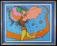 7 - PETER MAX "PLANETARIAN TRAVELER" SERIGRAPH 52/100 Peter Max (American,1937) titled "Planetarian Traveler" pencil signed and numbered 52/100 serigraph on arches paper. Raised embossed seal lower left. Produced in 1972. Measures 27" (69cm) width by 22" (56cm) height plus 2 1/2" (6cm) frame and matting.