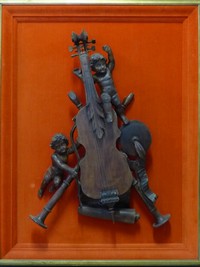 10 - CARVED WOOD SCULPTURE VIOLIN & TRUMPETS w CHERUBS Carved wooden sculpture depicting two cherubs on a violin in front of two crossed trumpets. Mounted to a frame for display. Sculpture measures 27" (68cm) height x 19 1/2" (49.5cm) width.
