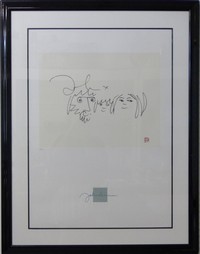 18 - JOHN LENNON & FAMILY LITHOGRAPH John Lennon (English, 1940-1980). print on white wove paper with John Lennon embossed decoration at the bottom. Depicts portraits of Lennon, Ono, and their child. Signed with Yoko's chop mark lower right. Pencil numbered 914/5000. Measures 28" (71cm) x 23" (58cm) + 5" (13cm) mat & frame.