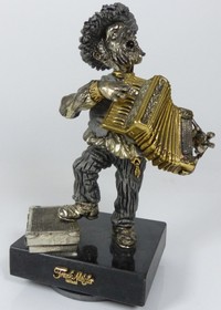 1 - FRANK MEISLER SCULPTURE OF MAN w PIANO ACCORDION Frank Meisler (German/Israeli, born 1929) Judaica metal sculpture depicting a man playing the piano accordion. Signed to marble base and numbered 340/1600. Measures 5 1/2" tall with 1 1/2" base.
