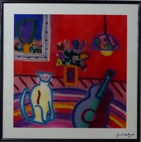 20 - JACK SHULTZ ACRYLIC ON PLEXIGLASS REVERSE PAINTING Jack Shultz, Southern California artist, acrylic on glass reverse painting. Depicting an interior scene with a guitar, cat, vase with flowers and chandelier in vivid colors. Signed and dated 1999 lower right. Measures 29 1/2" long by 29 3/4" wide 3 3/4" backing & frame.