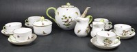 21 - 16pc HEREND ROTHSCHILD PORCELAIN TEA SERVICE 16 piece Herend Rothschild porcelain tea set including teapot - 10" length, covered sugar - 4 1/4" diameter, 2 creamers - 3 1/2" height, 6 teacups - 3 1/2" diameter and 6 saucers - 5 1/4" diameter.