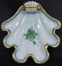22 - HEREND HUNGARY CHINESE BOUQUET GREEN SHELL DISH Herend Hungarian porcelain shell form dish in the green Chinese Bouquet pattern. Marked to bottom. Measures 9" (23cm) length x 8.5" (21cm) width.