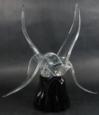 25 - MURANO ART GLASS SCULPTURE BIRDS IN FLIGHT Murano art glass sculpture depicting birds in flight attached to black glass wave form base. Measures 16" (40cm) height x 15" (38cm) depth.