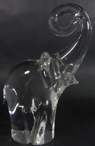 28 - OGGETTI MURANO ART GLASS ELEPHANT SCULPTURE Oggetti Murano art glass sculpture depicting an elephant with curled trunk. Measures 11" (28cm) height. Signed to bottom.