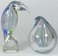 2 - 2pc MURANO FORMIA ART GLASS BIRDS w STRIPES 2 Murano Formia art glass birds, each with matching pink, green, blue and turquoise stripes to back. Each piece signed to bottom. Toucan measures 9" (23cm) height.