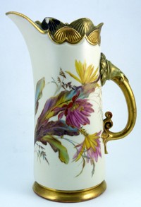 32 - ROYAL WORCESTER PORCELAIN PITCHER 1229 Royal Worcester porcelain pitcher with cream tones, gold trim, and assorted hand painted floral accents. Marked 1229 and 74149 to bottom. Measures 9 1/2" (24cm) height, total weight 718g.