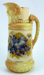 33 - ROYAL WORCESTER PORCELAIN MASK PITCHER 1366 Royal Worcester porcelain pitcher featuring a mask spout with cream tones, gold trim, and assorted hand painted floral accents. Marked to bottom 1366 and 119925. Measures approx 6 1/2" (16cm) height, total weight 232g.