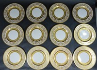 36 - 12pc CROWN STAFFORDSHIRE GOLD ENAMEL DINNER PLATES 12 Crown Staffordshire gold enameled porcelain dinner plates with gold enameled ring to underside (indicative of highest quality). Each plate marked to back and measures 10 1/4" (26cm) diameter.