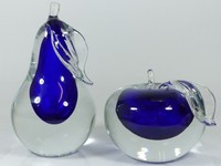 3 - PAIR CENEDESE MURANO ART GLASS FRUIT BOOKENDS Pair of Cenedese Murano sommerso blue and clear art glass bookends depicting an apple and pear. Can be used as book ends or as a sculpture (fruits fit together). Pear signed to bottom. Pear measures 9" (23cm) height.