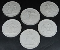 40 - 6pc ROYAL COPENHAGEN BISQUE PORCELAIN PLAQUES 6 neo-classical white bisque relief porcelain plaques. 5 marked Royal Copenhagen Demark and impressed 'Eneret'. Last plaque marked B&G. Largest measures 6" (15cm) diameter.
