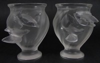 46 - PAIR LALIQUE 'ROSINE' FROSTED CRYSTAL DOVE VASES Pair of Lalique "Rosine" Frosted crystal dove vases. Each measures 5" (12.5cm) height. Each signed to bottom.
