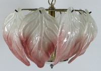 48 - MURANO FROSTED GLASS LEAF CHANDELIER Murano chandelier with eight glass leaves, frosted with pink tips. Each leaf measures 9" length. Frame of chandelier measures 12" diameter (30cm).