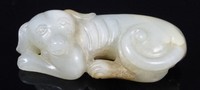 6 - CHINESE WHITE JADE RECUMBENT DOG CARVING Chinese white jade carved recumbent dog. Measures 2 1/4" (5.7cm) length. Total weight 37.8g.