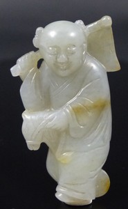7 - CHINESE GREYISH-WHITE JADE BOY CARVING Chinese carved grayish-white jade of a boy with horse and flag in hand. Measures 2 1/4" (5.7cm)