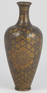 11 - JAPANESE MEIJI PERIOD MIXED METAL VASE Japanese Meiji period finely inlaid gold and silver mixed metal vase. Depicts floral designs and a dragon to the neck of the vase. Calligraphy markings to bottom. Measures 5" (13cm) height, total weight 173g.