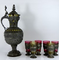13 - 19th C GERMAN PEWTER AMBER GLASS EWER w 6 GLASSES 19th Century ornate pewter ewer with amber glass insert plus six glasses with pewter mounts. Four glasses with cranberry inserts, other two with amber glass inserts. Ewer measures 18" (46cm) height. Each glass measures 5" (13cm) height.